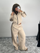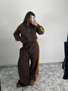 coordinato felpato, pantaloni elastici e felpa con zip e cappuccio. Veste fino ad una L.