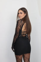 Accessorio in pizzo , tuta intera con scollo sul retro .