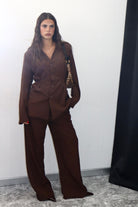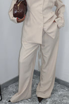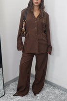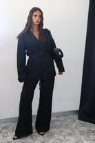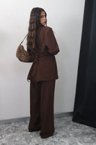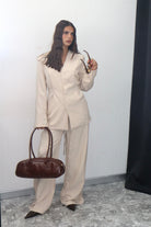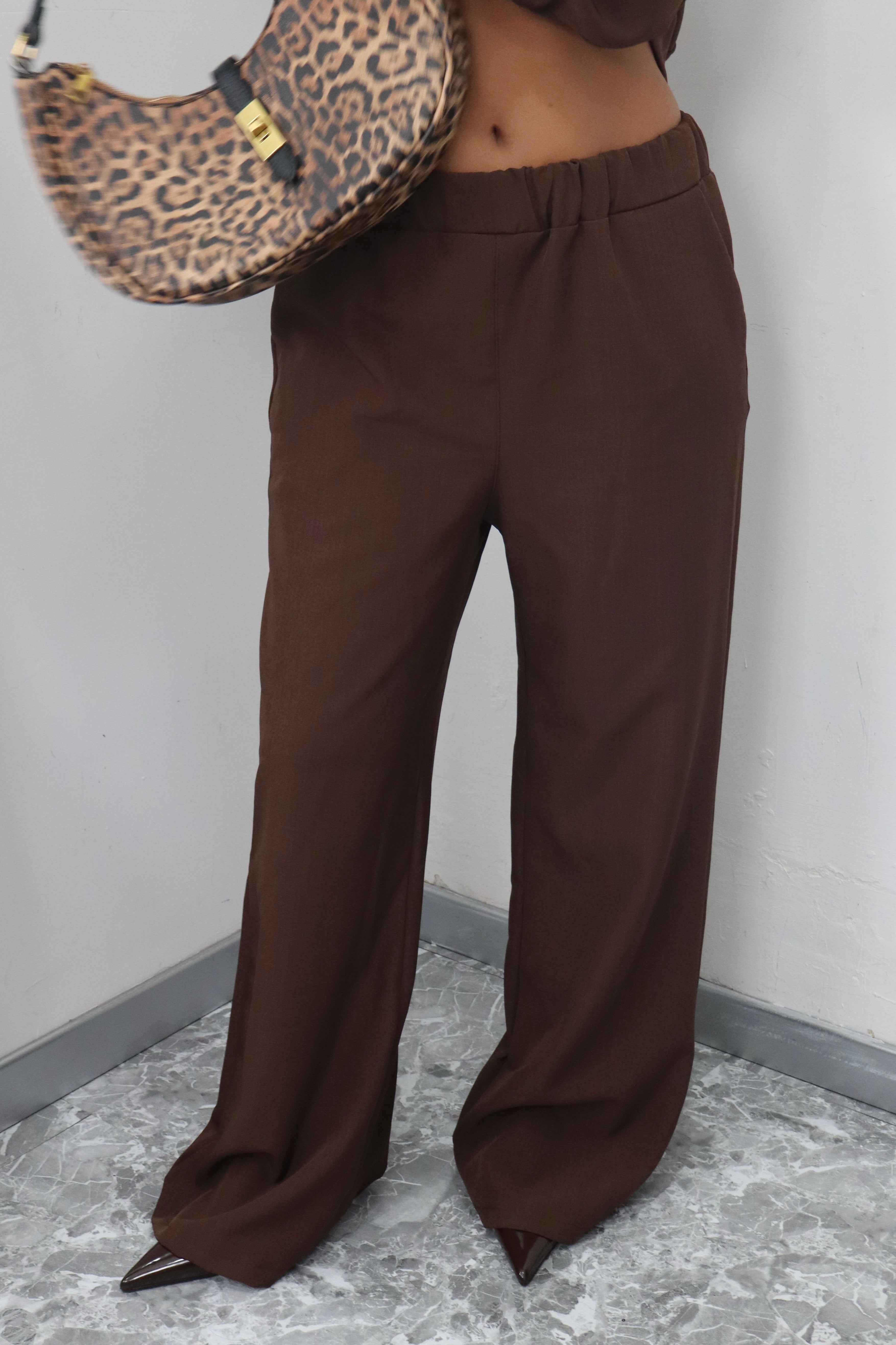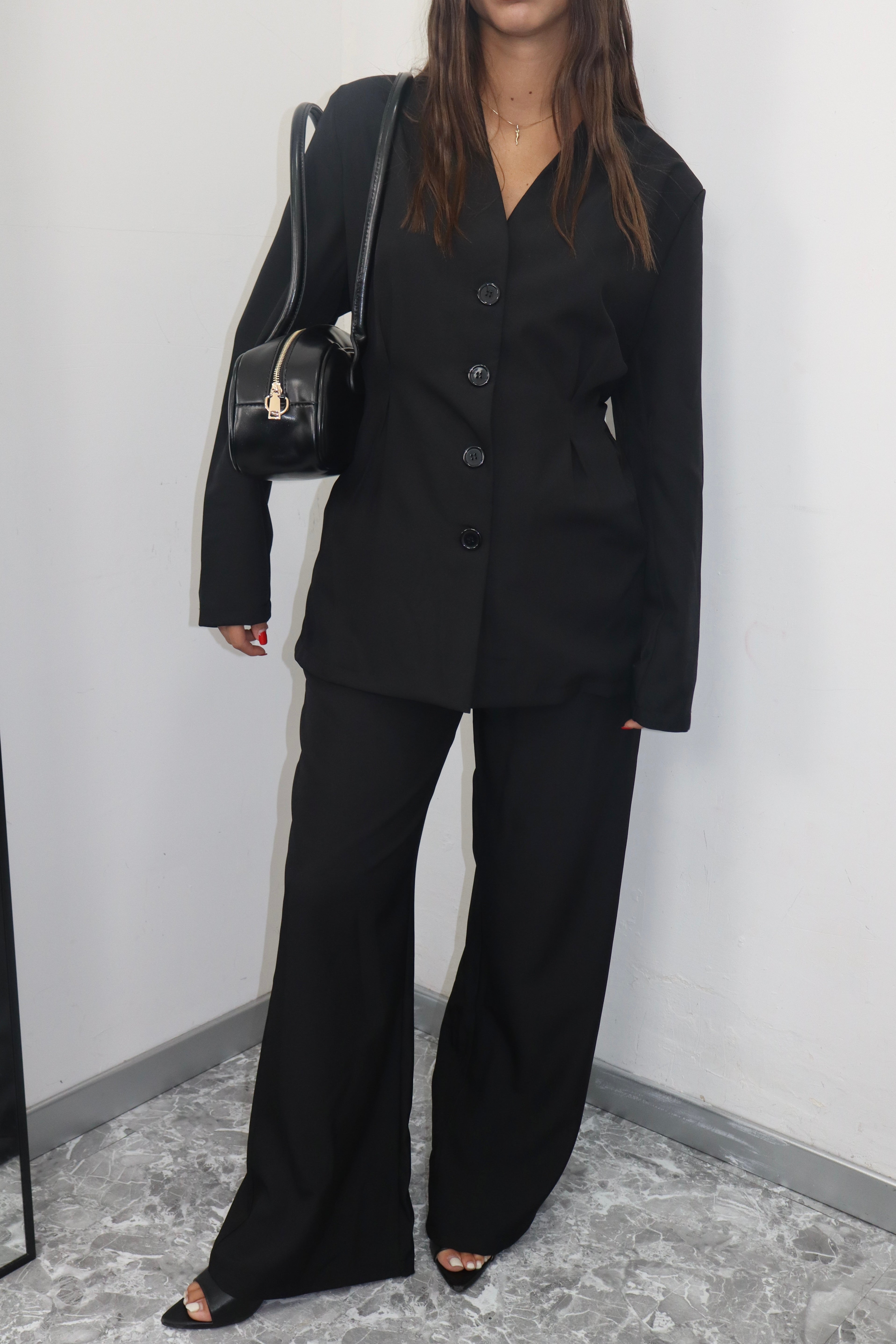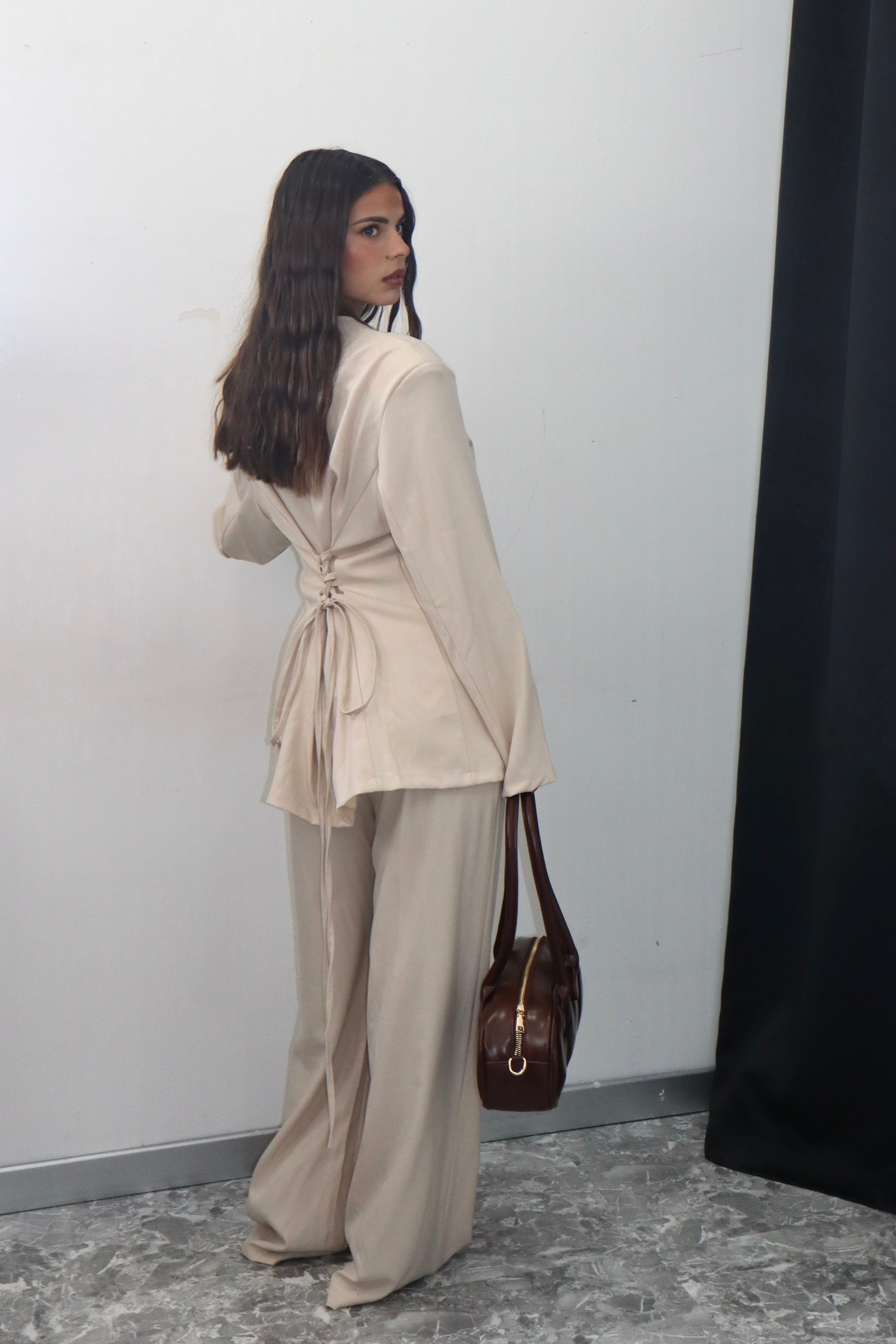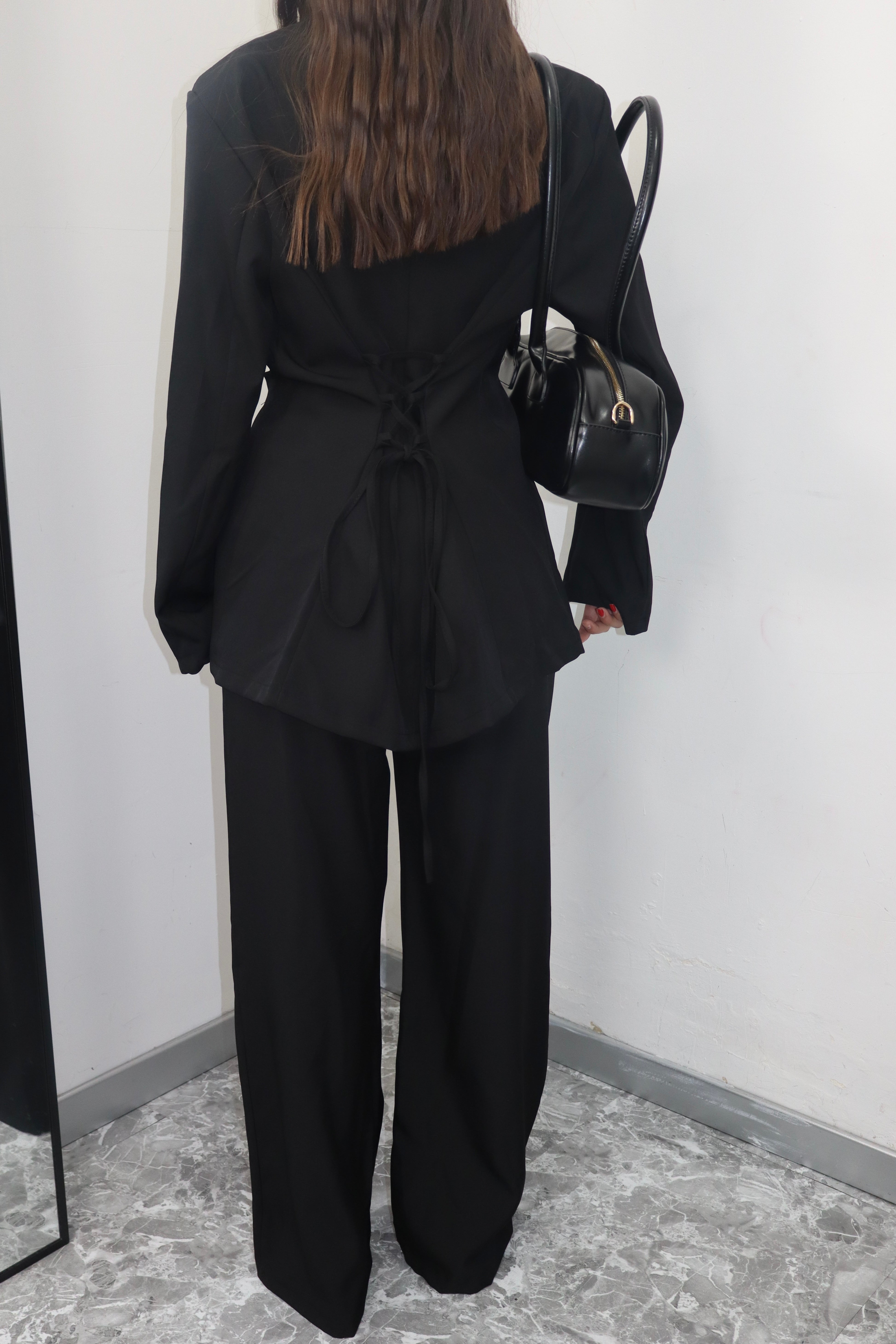 Crea un look moderno e sofisticato con il nostro tailleur, composto da una giacca con eleganti stringhe sul retro e pantaloni elasticizzati per la massima comodità. Aggiungi un tocco di stile al tuo guardaroba e fatti notare in ogni occasione.