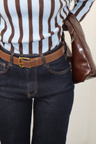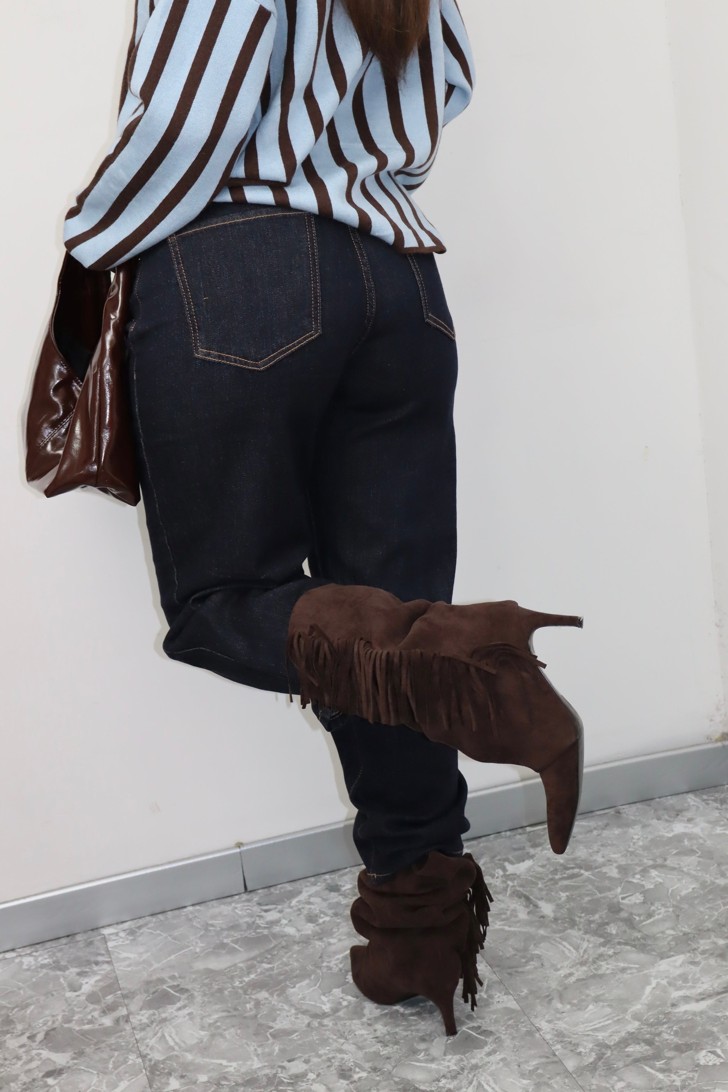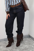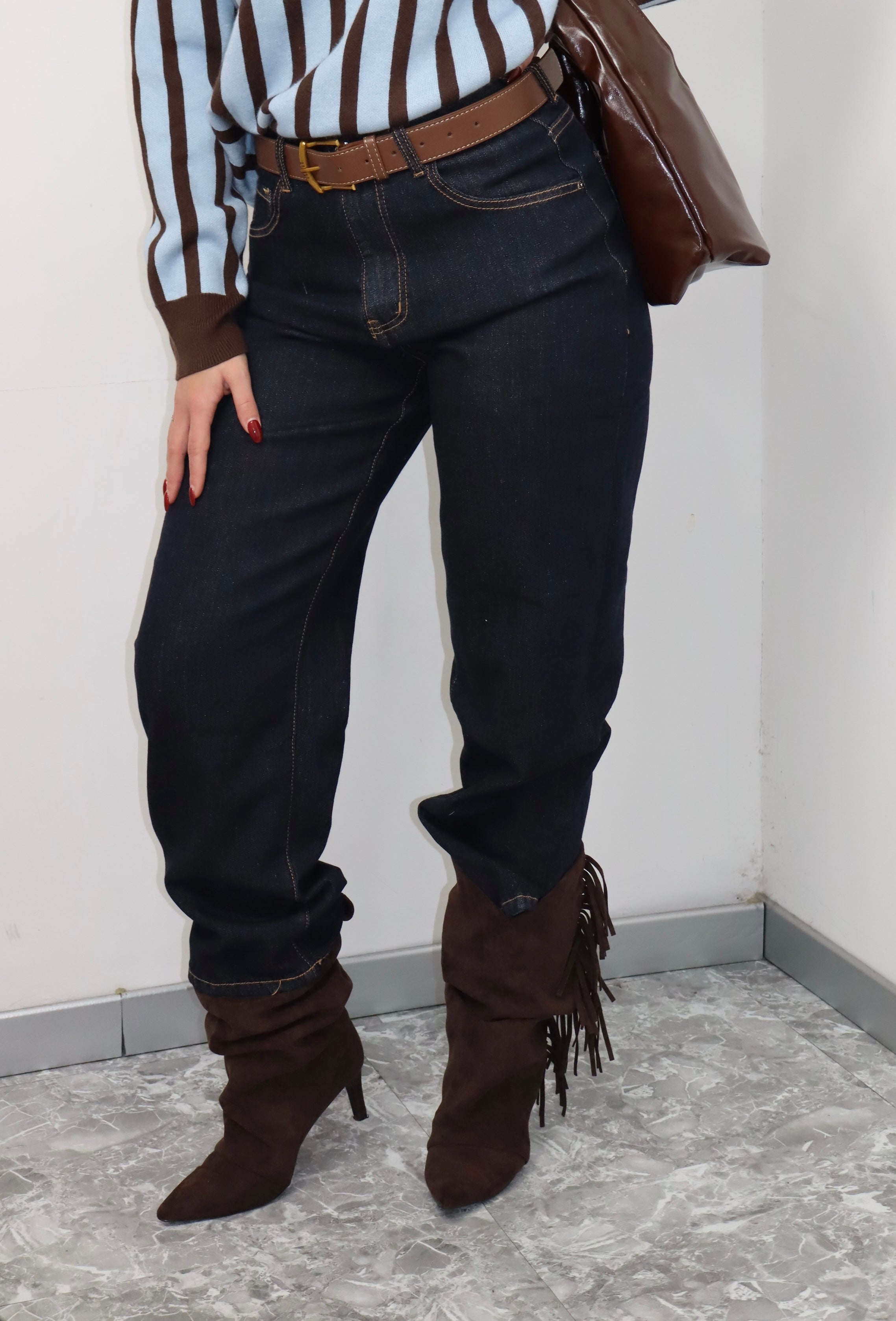 Jeans denim scuro , mom fit , cintura inclusa la modella indossa una S.