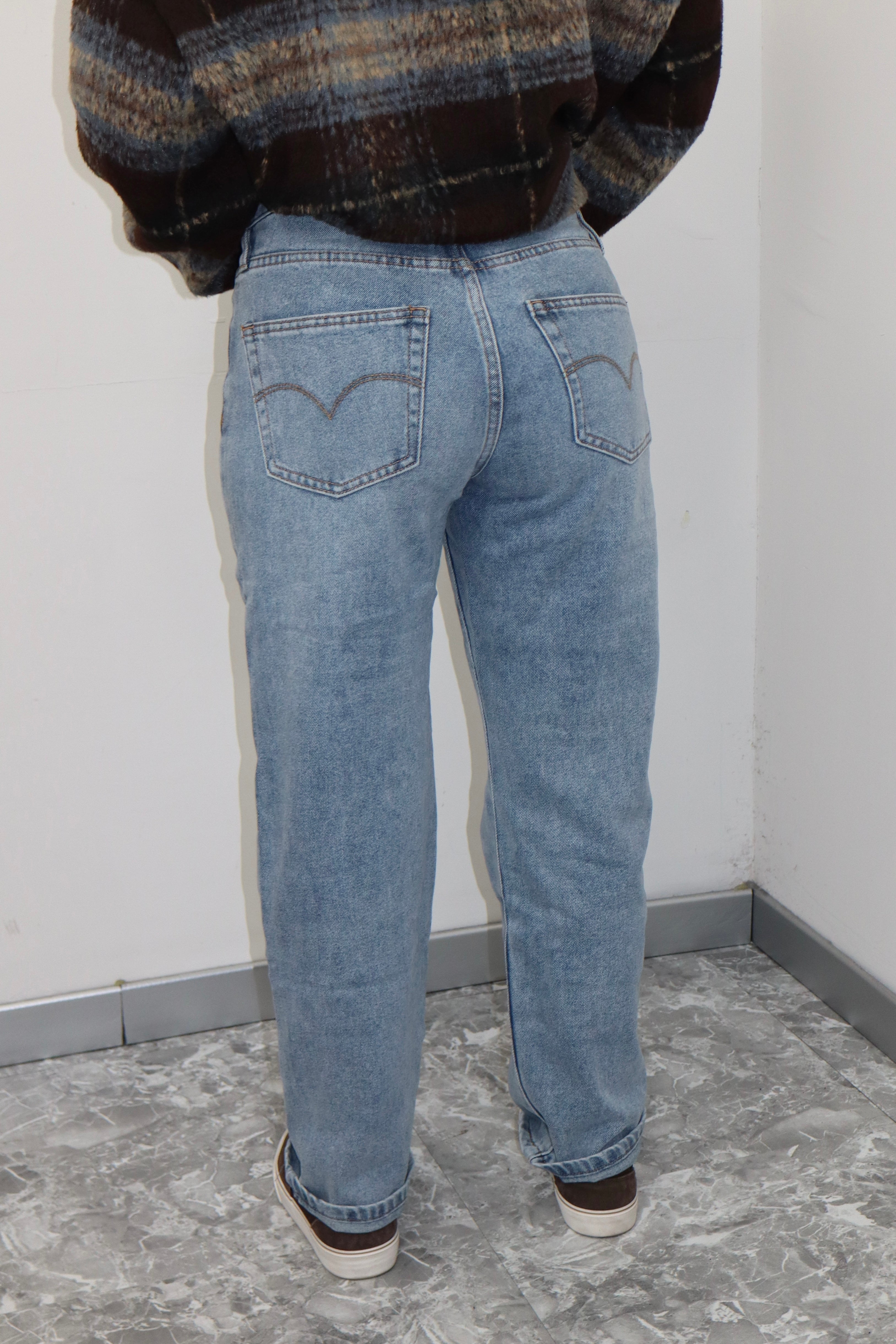 Jeans straight lavaggio chiaro , la modella é alta 1,60 cm circa indossa una 36EU.