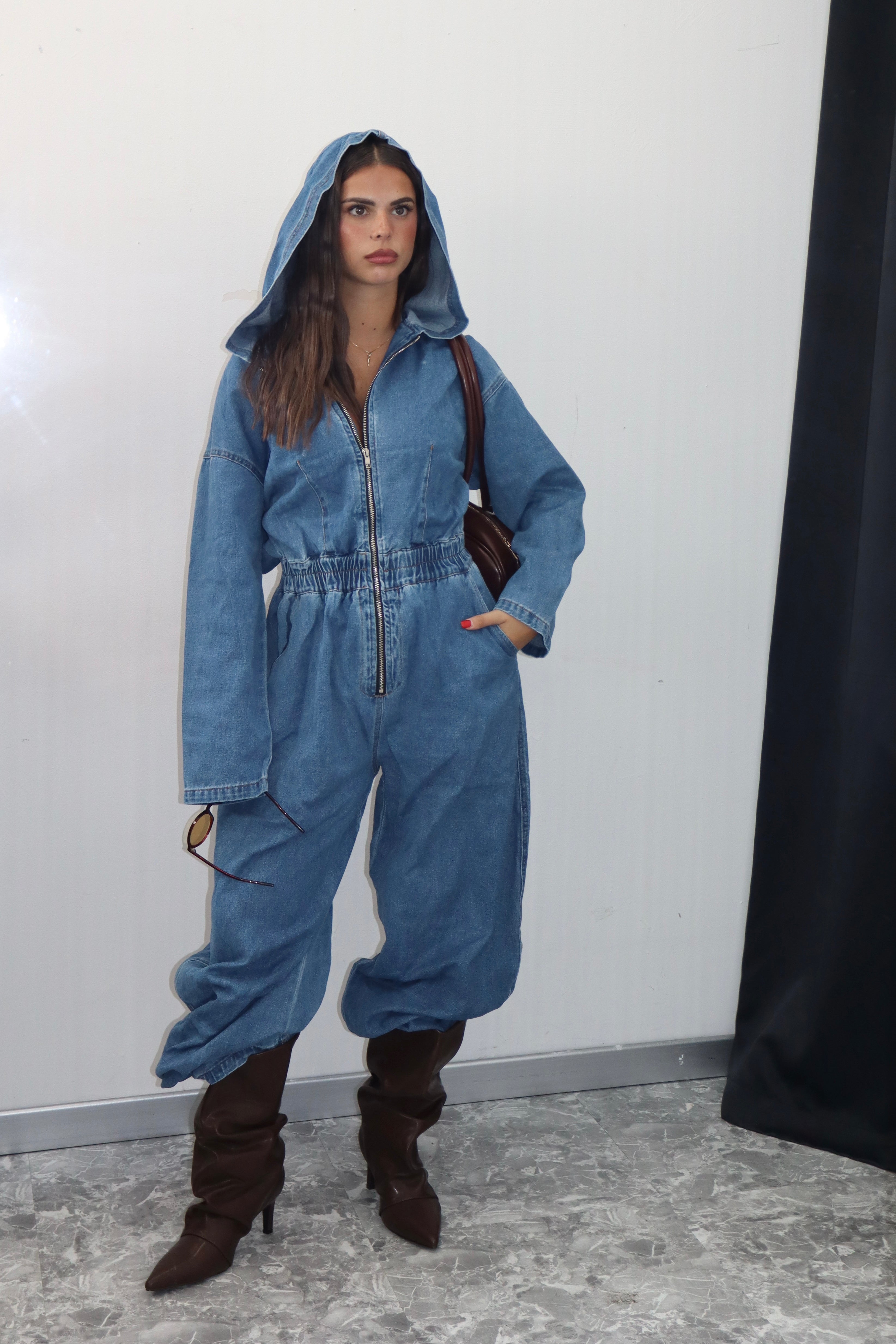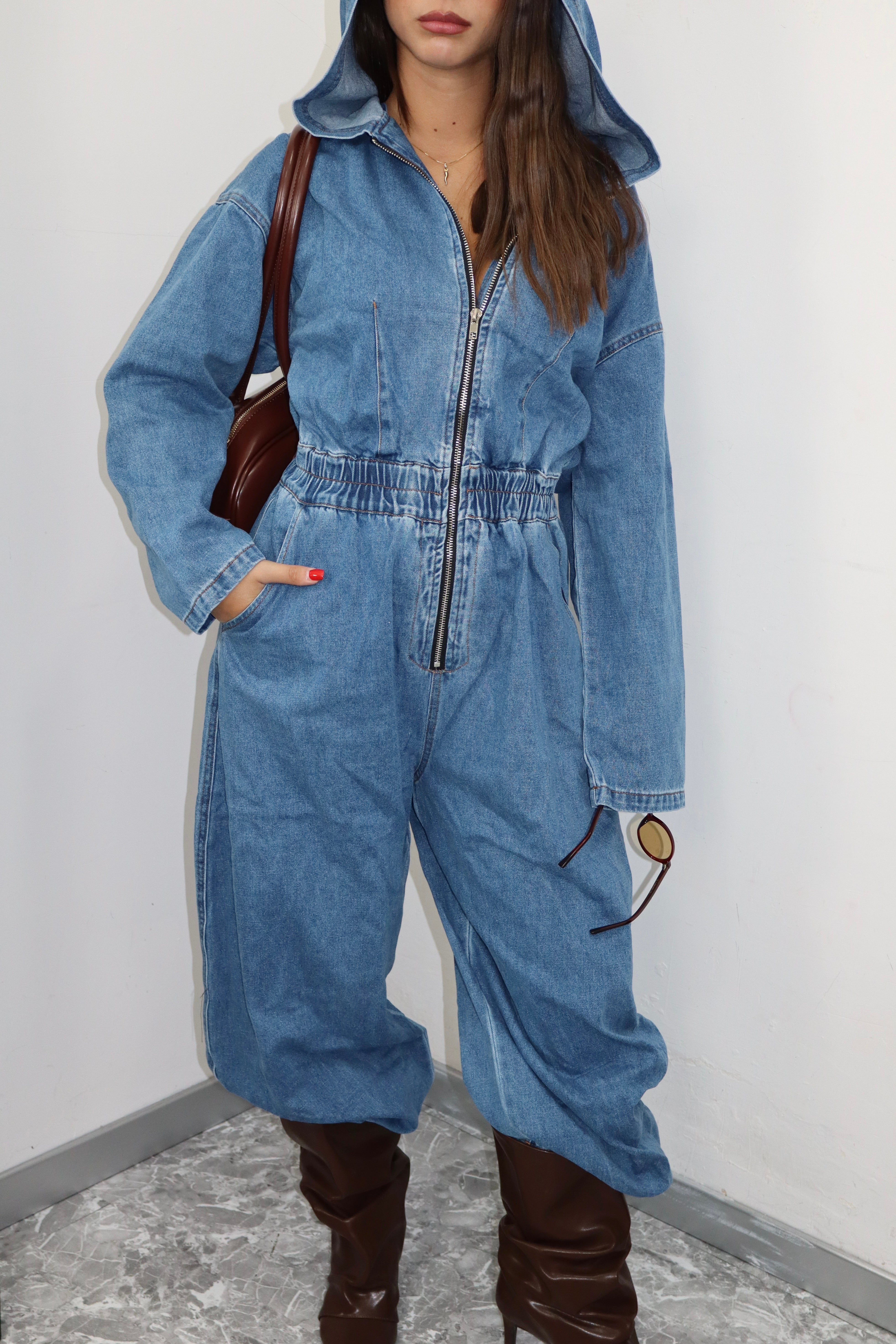 cVivi uno stile unico con la nostra tuta in denim con cappuccio! La tuta è composta da una pratica zip e un cappuccio, perfetto per tenerti al caldo durante le giornate più fredde. Aggiungi un tocco di stile al tuo guardaroba e sentiti comodo e alla moda con la nostra tuta denim.