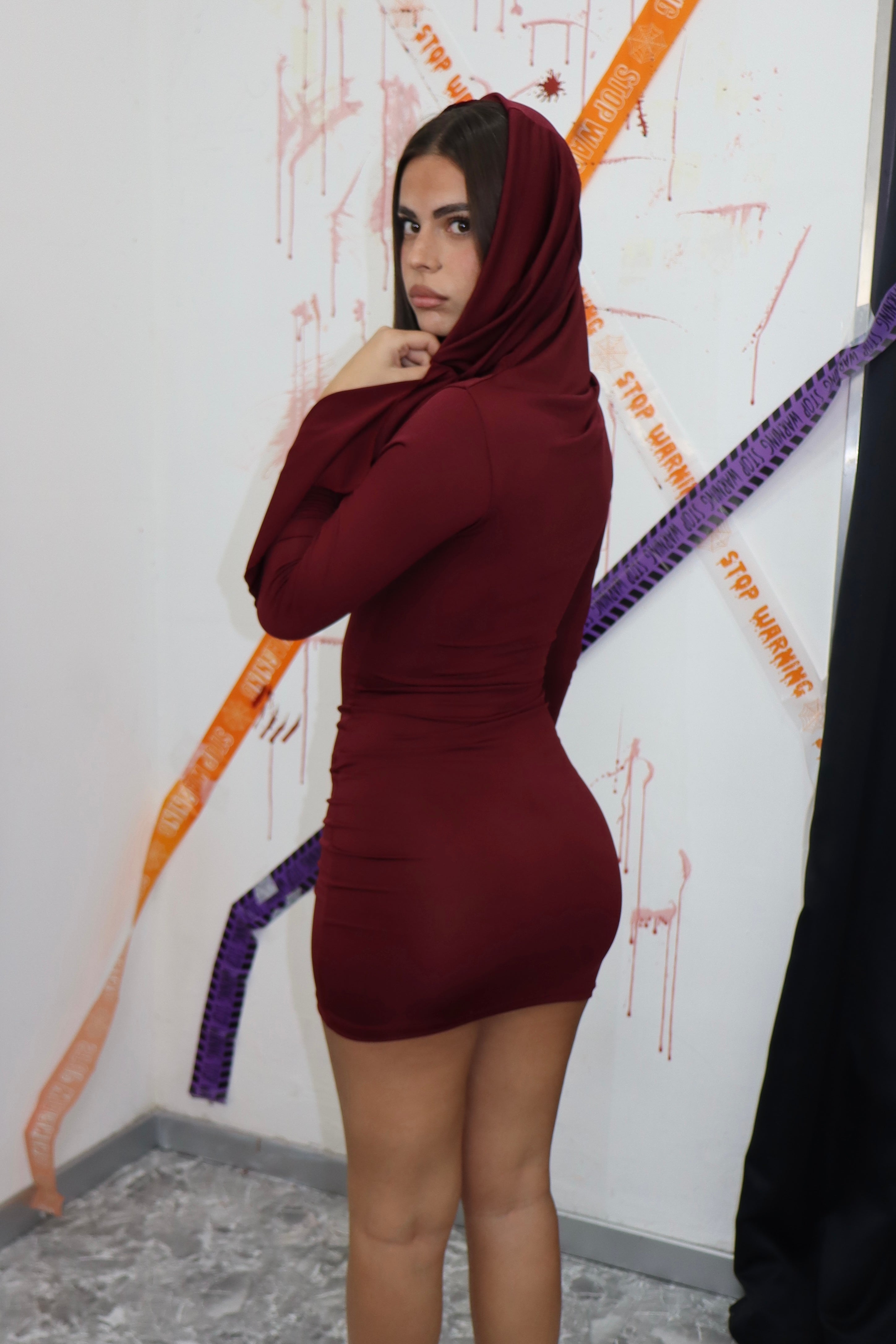 abitino corto con cappuccio e manica rouches, taglia unica.