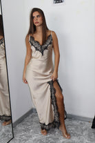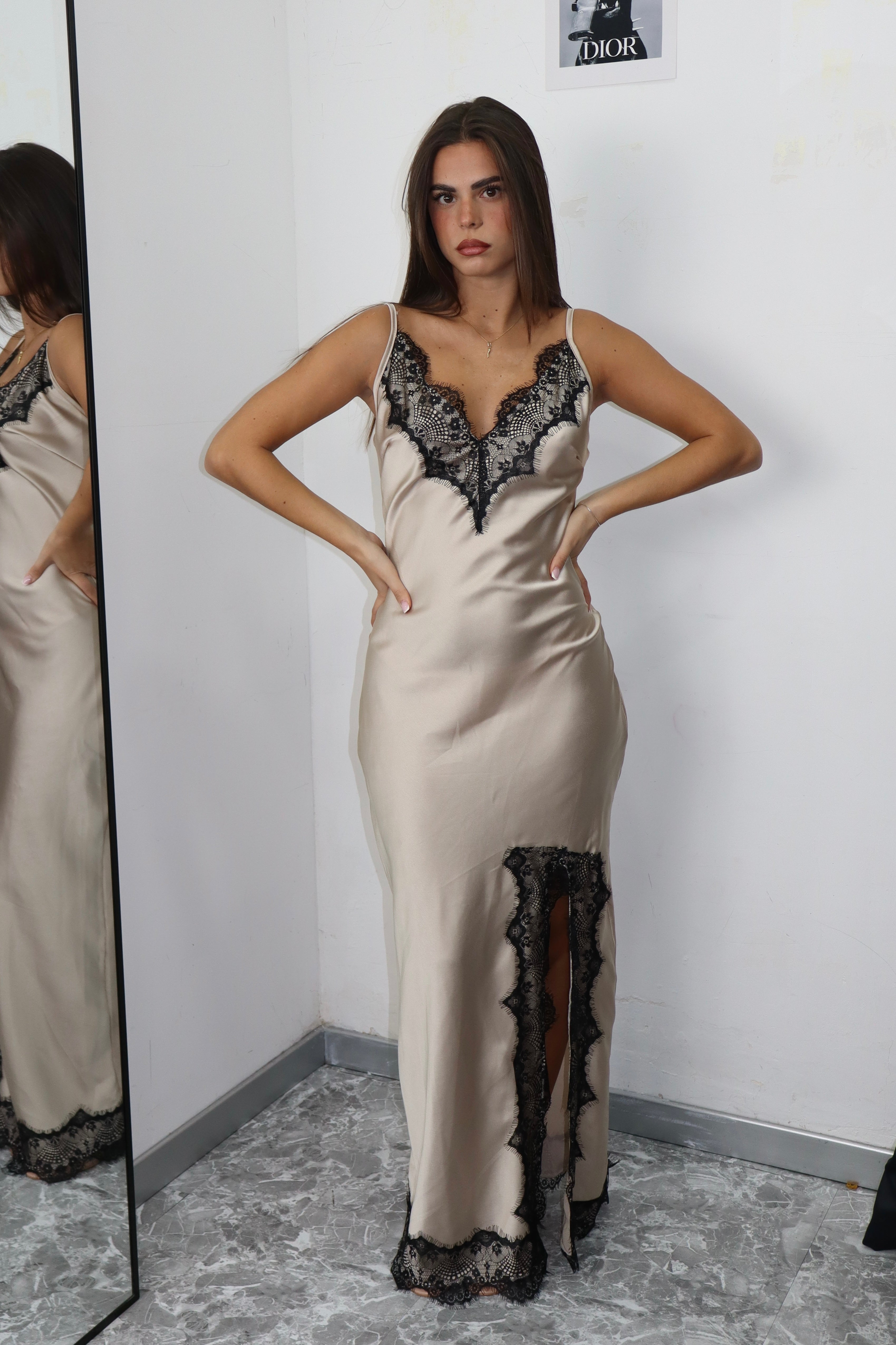 abito effetto seta, con ricami in pizzo neri, regolabile sul retro, taglia unica.