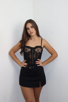 Body con bretelle regolabili e ricami, effetto bustino , la modella indossa S/M.