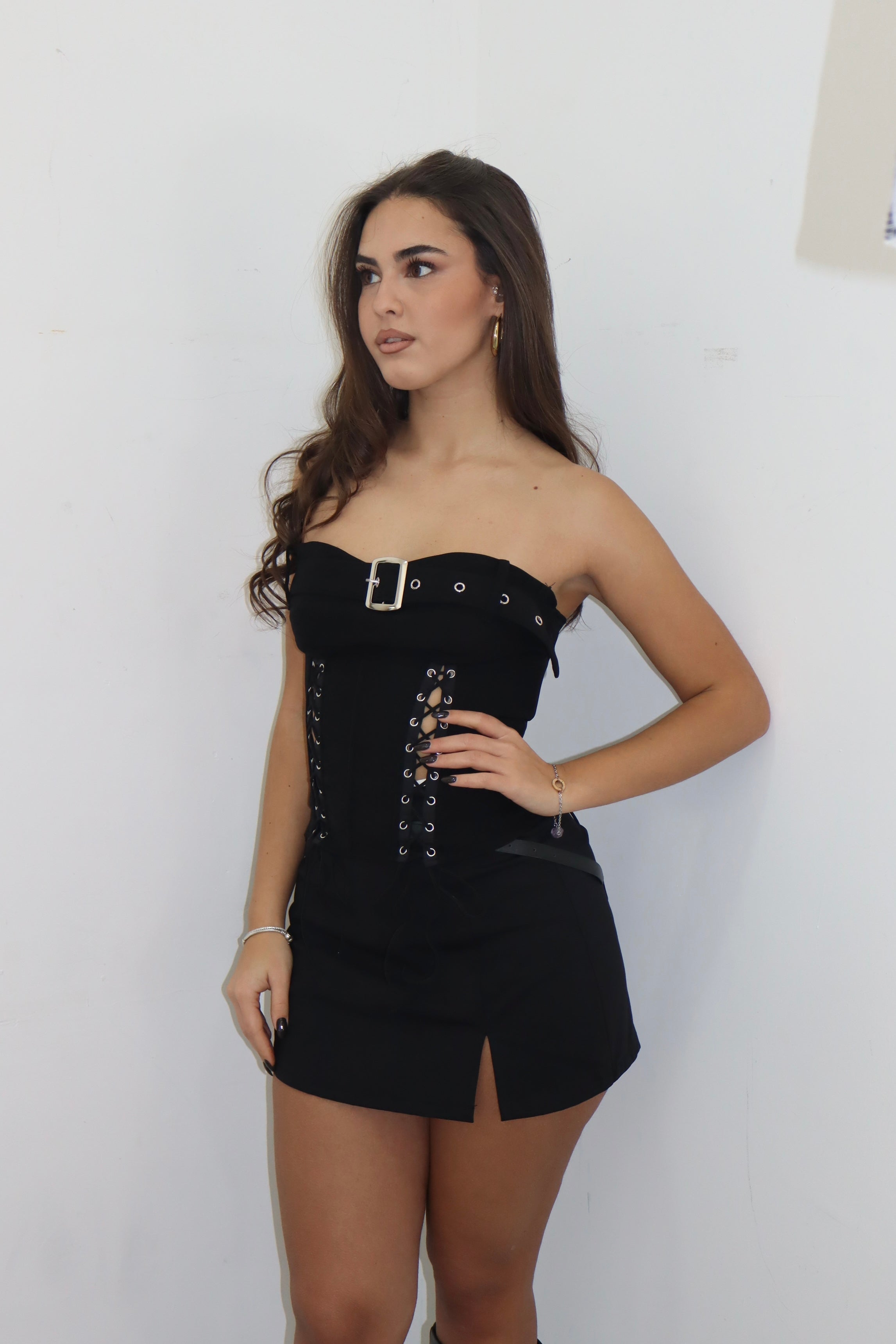 Corsetto nero con lacci regolabili anche sul retro , la modella indossa una S/M.