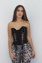 Corsetto nero con stringhe, la modella indossa S/M .
