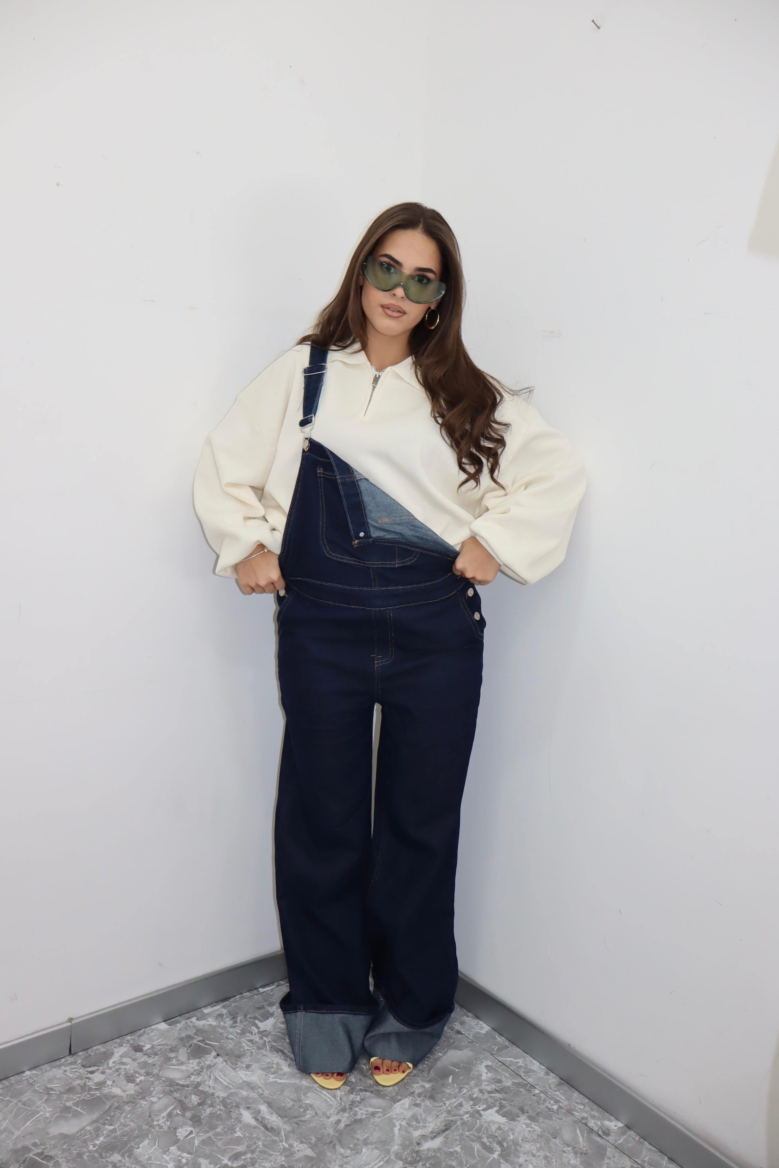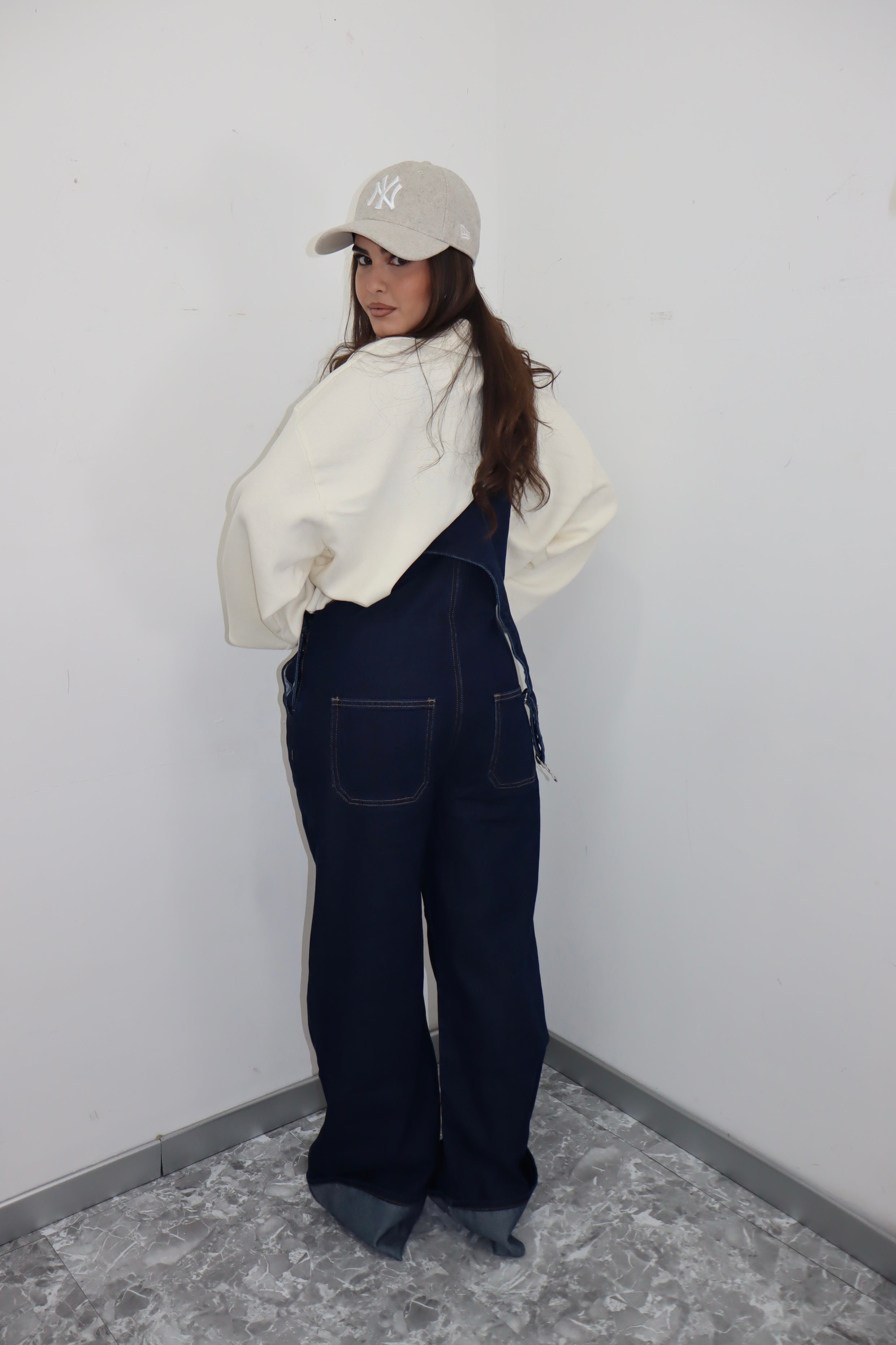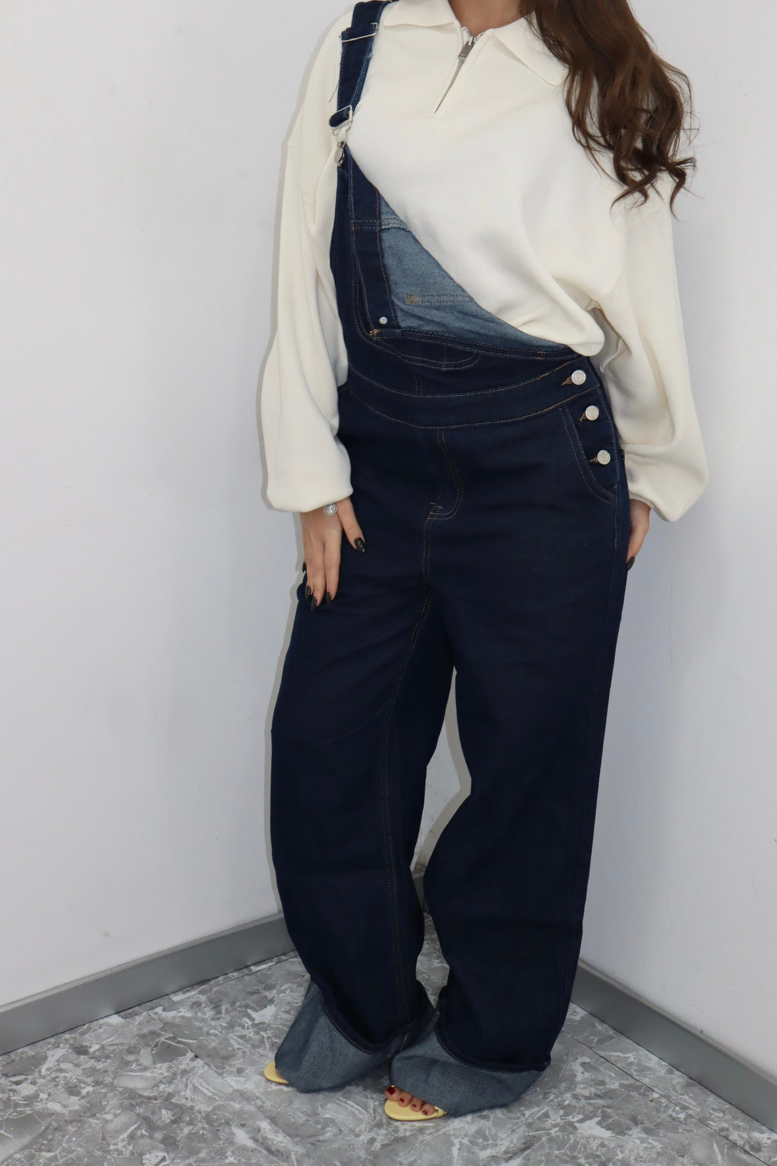 Salopette denim scuro con piegoni cuciti , la modella indossa una M per un effetto vita bassa.